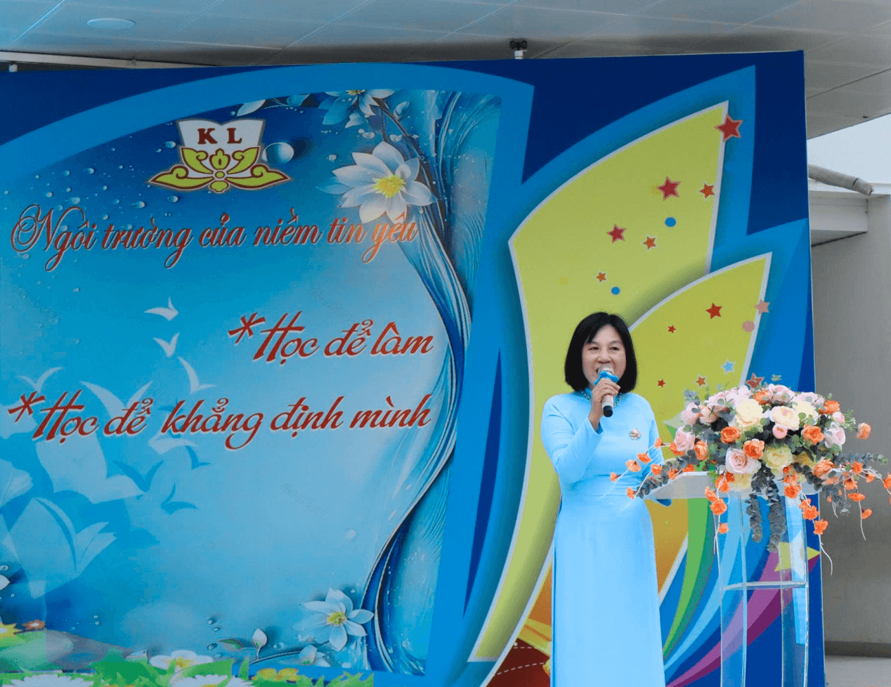 Cô Hiệu trưởng nhẹ nhàng gửi lời chào mừng đầy xúc động tới các em học sinh lớp 1, và giới thiệu 8 cô giáo chủ nhiệm khối 1 – những người mẹ sẽ đồng hành cùng các con trong năm học đầu đời. Những bó hoa tươi thắm được trao gửi tới các cô không chỉ là lời chúc mừng, mà còn là niềm tin yêu của nhà trường, phụ huynh và các em nhỏ.
