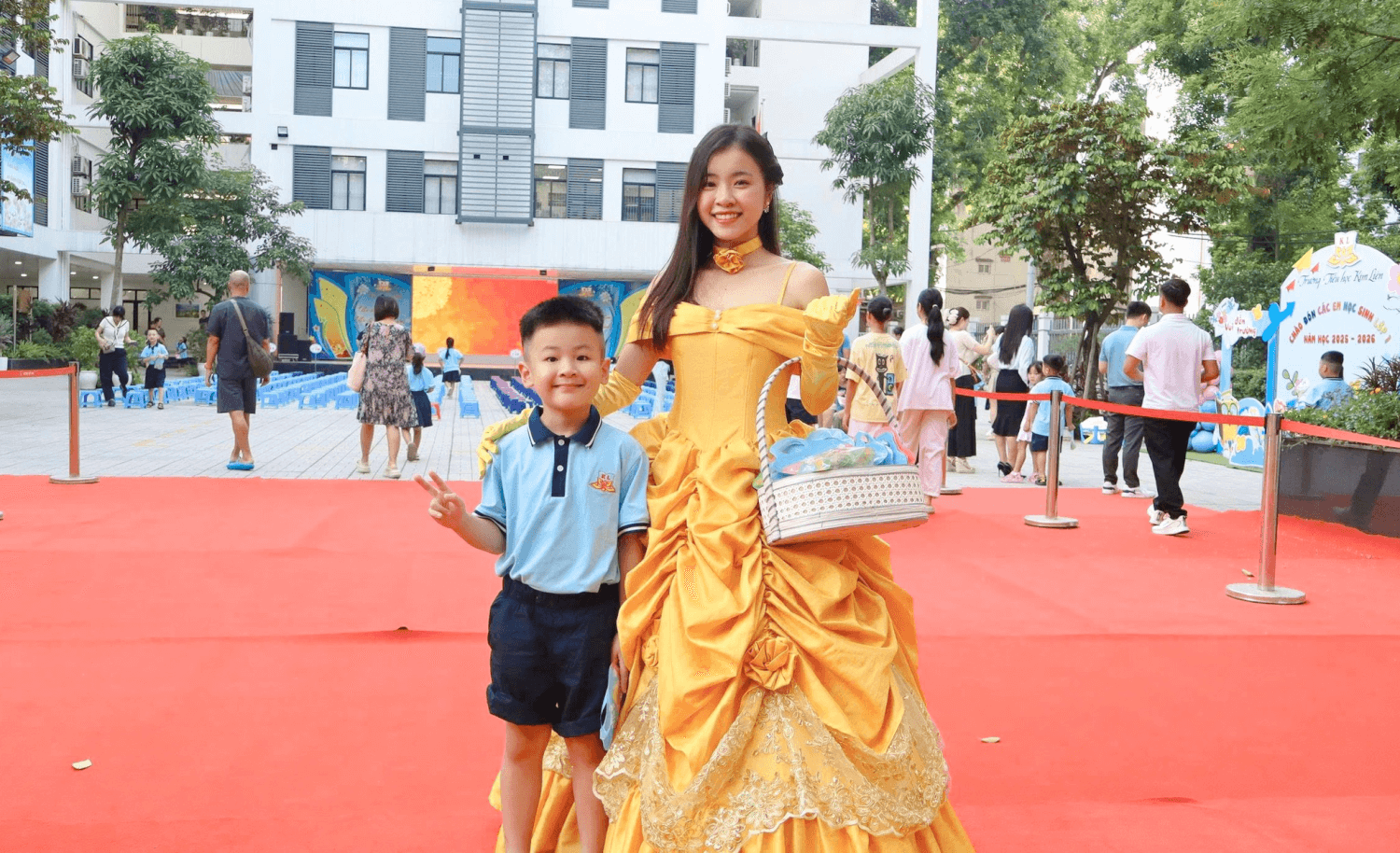 Khi không khí còn rộn ràng, giọng hát ngọt ngào của bạn Ngọc Minh học sinh lớp 1G cất lên với ca khúc “Hello Việt Nam” với phần đệm violon của bạn Tâm An lớp 4G, khiến cả sân trường lắng lại. Bài hát như một lời chào thân thương gửi tới thầy cô và bạn bè mới.