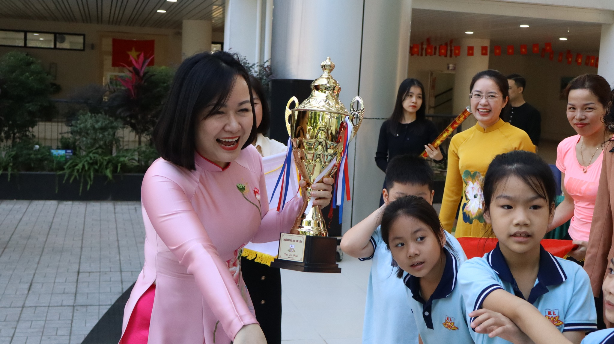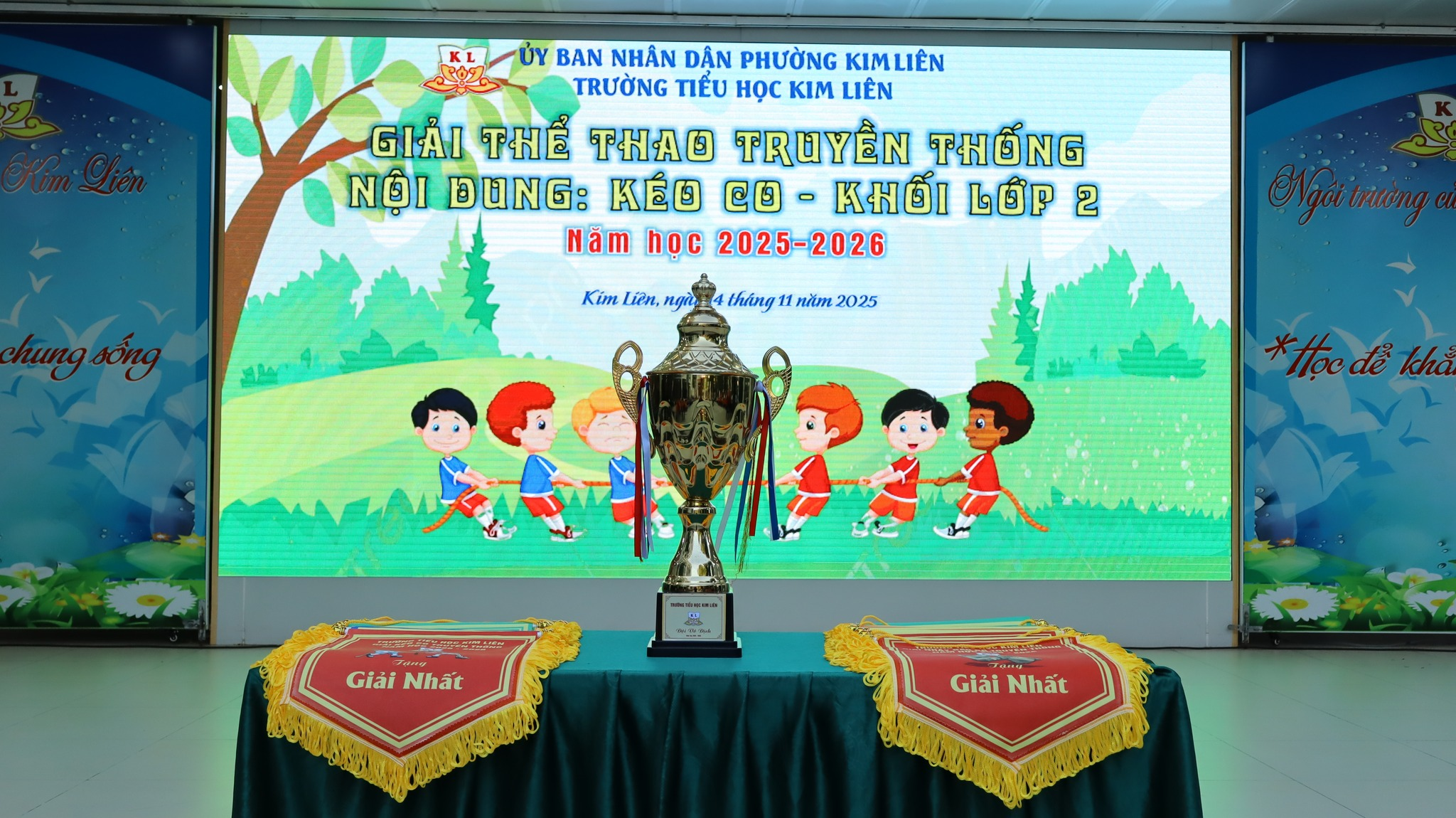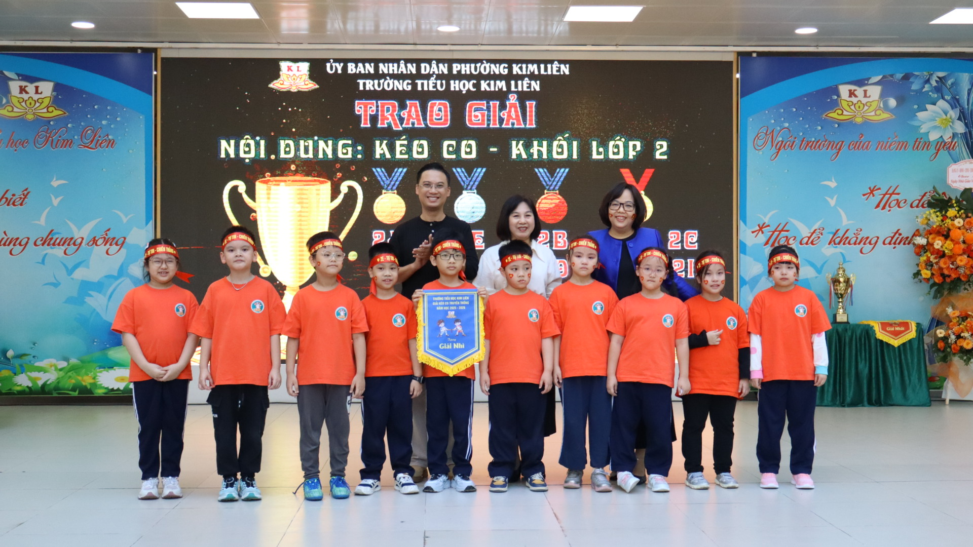 Giải đấu vô cùng vinh dự được đón bà Lê Thị Kim Huệ – Chủ tịch UBND phường Kim Liên cùng các lãnh đạo của phường Kim Liên đến chúc mừng Nhà trường nhân dịp kỉ niệm 43 năm Ngày nhà giáo Việt Nam (20/11/1982 – 20/11/2025). Bà Lê Thị Kim Huệ cùng nhà giáo Nguyễn Linh Chi – Hiệu trưởng nhà trường đã trao cúp và cờ lưu niệm cho nhà vô địch của giải đấu: các con học sinh lớp 2H![]()