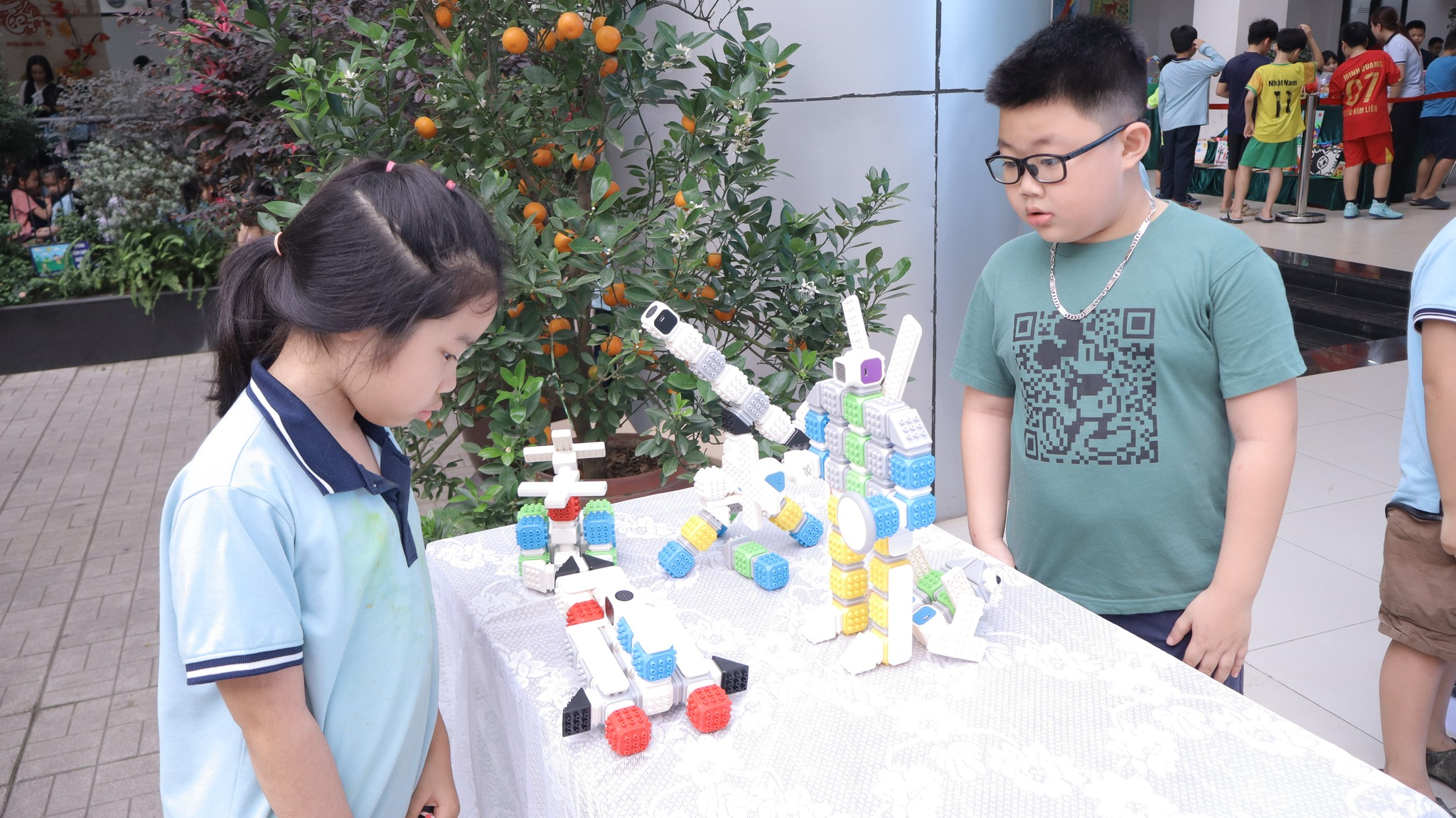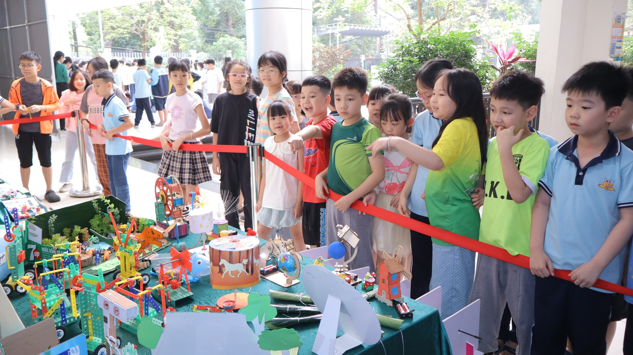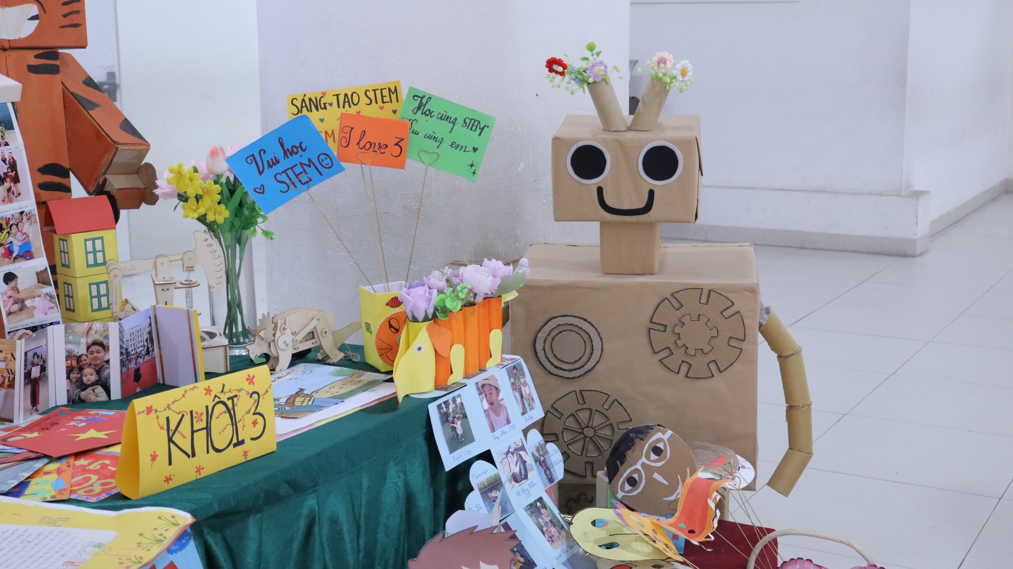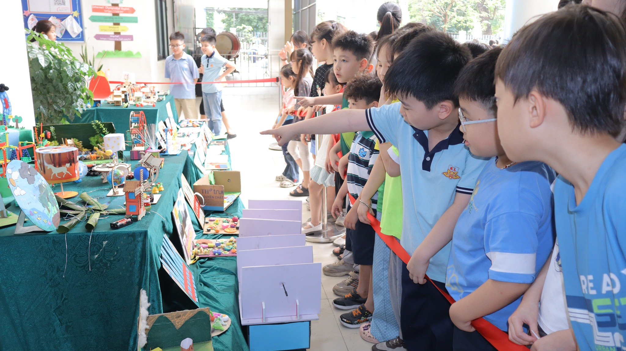 Các gian trưng bày sản phẩm STEM của từng khối lớp đã mở ra một không gian học tập sinh động, nơi kiến thức được “hiện thực hóa” bằng những mô hình sáng tạo, độc đáo và đầy tính ứng dụng.