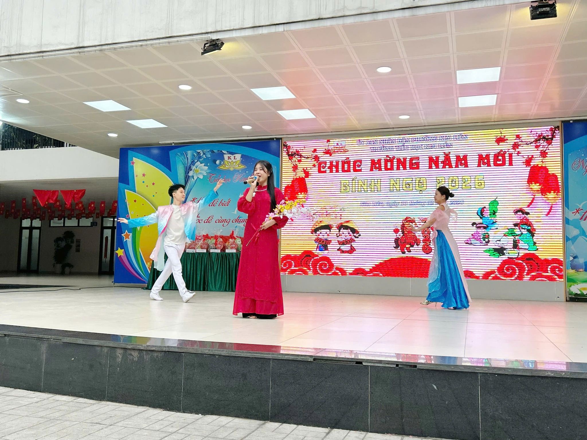 Tiếp đó, tiết mục Đoản xuân ca của cô giáo Quỳnh Mai như mang mùa xuân, mang Tết đến gần hơn với các bạn nhỏ Tiểu học Kim Liên.